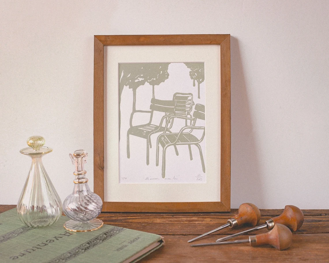 Linogravure Jardin du Luxembourg – « M’asseoir avec toi »
