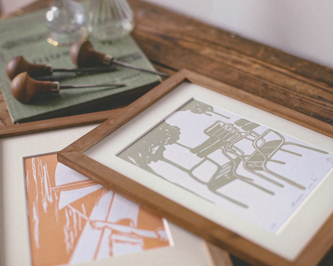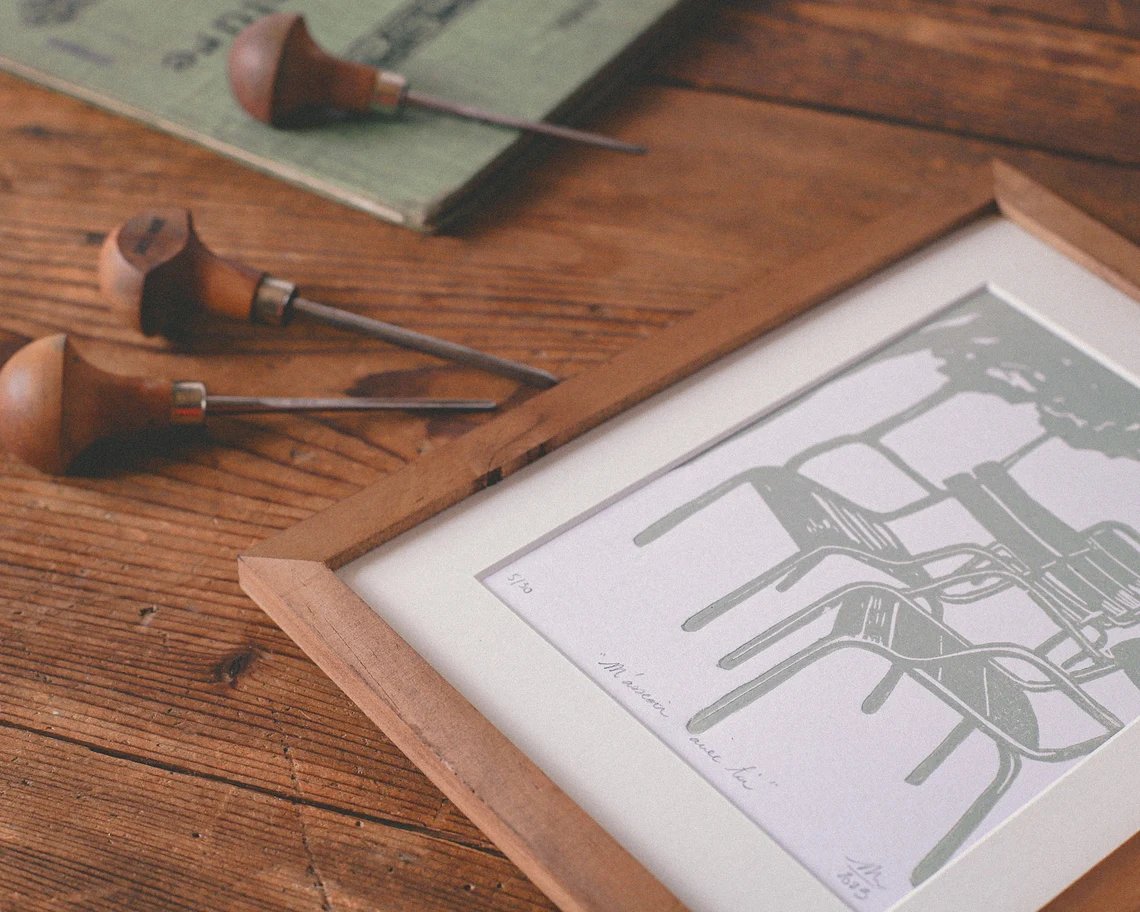 La linogravure est un processus artisanal, chaque dessin est dans un premier temps gravé sur une plaque de linoléum, puis imprimé manuellement et individuellement sur le papier. Chaque tirage est donc unique, et peut comporter des nuances et des aspérités propres au charme de l’impression artisanale.