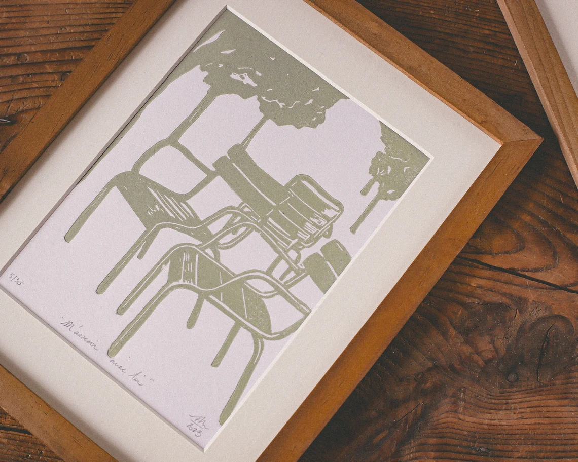 Linogravure inspirée par le Jardin du Luxembourg – « M’asseoir avec toi ».