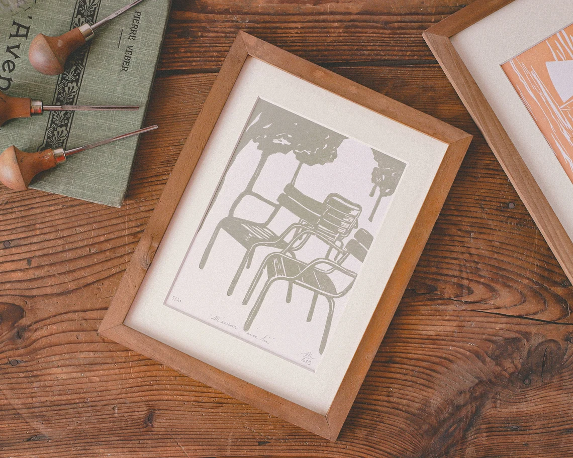 Soyez le premier à laisser votre avis sur “Linogravure Jardin du Luxembourg – « M’asseoir avec toi »”