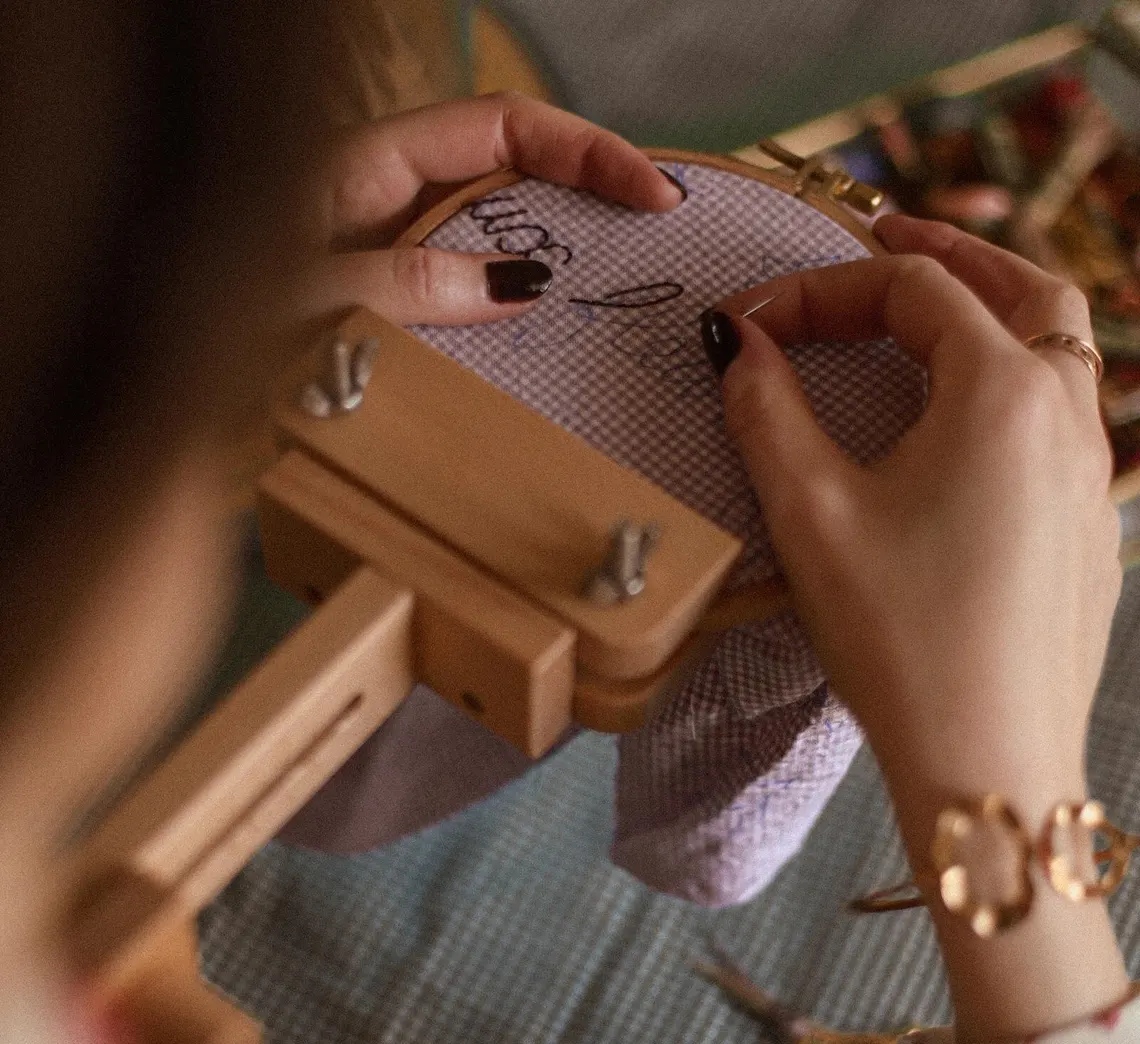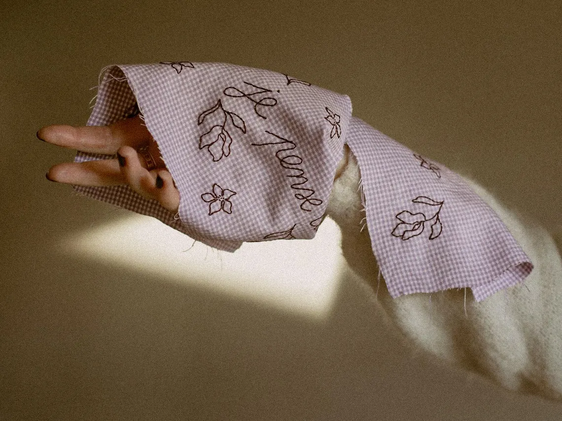 « Je pense aux fleurs », modèle de broderie minimaliste, s’invitera sur divers supports d’expression, par exemple pour orner quelques accessoires ou du linge de maison avec une touche de poésie fleurie. Il est suggéré ici sous forme de chouchou pour les cheveux, laissant apparaître subtilement son message.